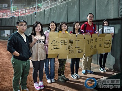 金門高職22日晚間6點出戰北門農工,金門高職加油區上方看台一群來自金門的鄉親替他們加油打氣,親友團們就地取材作了加油看板替球員助陣,金門人小螞喊到「燒聲」。金門...
