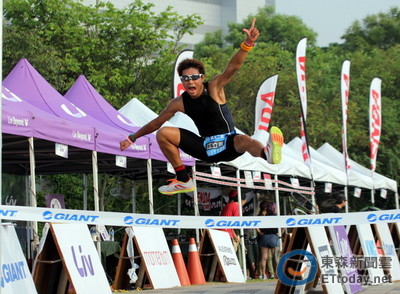 2015年捷安特盃今天(20)在台中科學園區舉行最後一天活動,鐵人兩項由台中二中體育老師江立堯完成二連霸,笑稱自己運動成癮的他,還飛踢躍過終點線,慶祝自己的勝利。