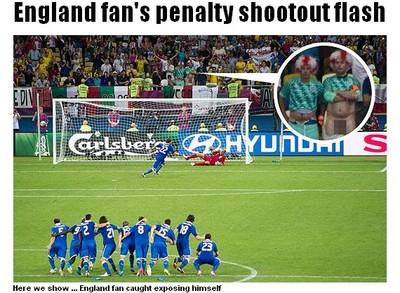 歐洲國家盃足球賽,英格蘭PK輸給義大利,有趣的是,看台上居然有英格蘭球迷露出下體干擾對手球員12碼射門,被攝影師拍個正著。