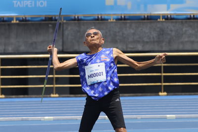 2025雙北世界壯年運動會田徑賽事今(18)日登場,本屆大會最年長的選手、高齡105歲泰國人瑞薩旺(Sawang Janpram)單日囊括雙金,在男子100歲以上組標槍與100公尺都登頂...