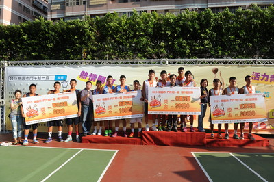 2015桃園市鬥牛尬一夏三對三籃球賽,經過四天塵戰,6日下午在內壢高中由桃園市副市長邱太三頒獎閉幕,家住中壢區中正運動公園附近,來自4 所不同學校的青男組冠軍隊-魯...