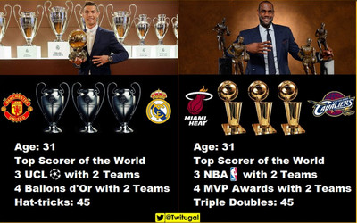 西甲球隊皇馬C羅及NBA騎士當家球星詹姆斯,可以說是當今足壇及籃壇中的第一人,兩人的身體素質都相當出色、在場上的霸氣也是有目共睹,而近日更有網友比較兩人的數據,...