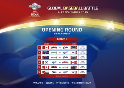 2019世界12強棒球賽預賽在11月開打,世界棒壘總會在4月12日宣布A組、B組賽程,15日在韓國宣布C組賽事,韓國先後出戰澳洲、加拿大及古巴。