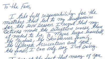 繼日前與洋基球團會面,並向球隊高層道歉之後,強打A-Rod於18日以親筆寫信的方式,透過大聯盟官網向球迷公開致歉,期望大家能夠原諒他所犯的錯,而自己承受大聯盟史上最...