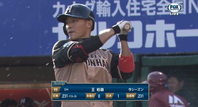 日職日本火腿2日在仙台客場出賽樂天金鷹,王柏融先發第5棒指定打擊,日職生涯首次客場出賽,比賽在下雪中進行,一局下一出局一度因雪勢過大暫停,恢復進行後,王柏融在2...