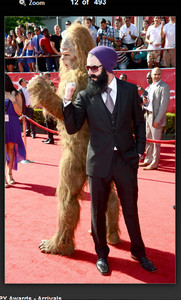 舊金山巨人守護神威爾森(Brian Wilson)去年以一襲緊身燕尾服的超酷裝扮參加ESPY頒獎典禮,今年他的打扮雖然顯得「保守」許多,但卻帶了個毛茸茸的夥伴助威。