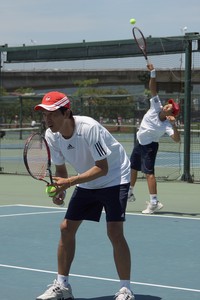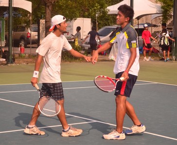 「呵!Come on!」稚嫩的吶喊聲在內湖彩虹河濱公園響起,「FILA盃青少年B級網球錦標賽」6日開打。中間雖因雨勢過大停賽將近三小時,但仍不減選手激戰的熱力。