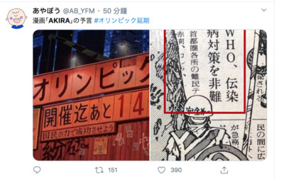 日本首相安倍晉三和國際奧會(IOC)主席巴赫(Thomas Bach)達成共識,東京奧運將延期一年,最晚在2021年夏天舉辦。而這因為傳染病使得奧運延期的情節,1988年上映的日...
