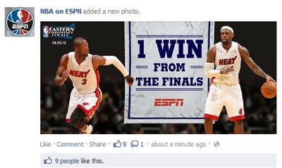 美國NBA on ESPN的官方臉書,居然在東區決戰搞出烏龍,在雙方第五戰還剩1分鐘時,就在臉書上傳了一張「熱火再一勝,成東區冠軍」的照片。發現出錯後才趕緊撤下,換上第...
