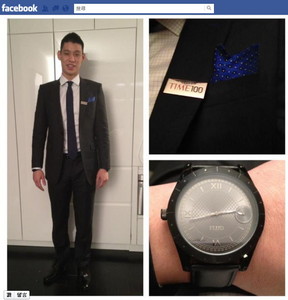 NBA台裔球星林書豪獲選《時代》(TIME)雜誌2012年年度百大人物榜首,美東時間24日出席頒獎典禮領獎,國內外媒體爭相報導。會後他把出席盛會的行頭PO上臉書,與粉絲分享他...