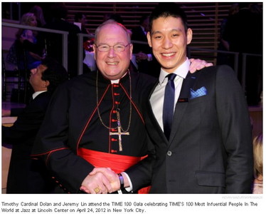 《時代》(TIME)雜誌2012年年度百大人物頒獎典禮,美西時間24日晚間在紐約林肯中心舉行,名列百大榜首的NBA球星林書豪(Jeremy Lin)深受矚目,晚宴上與樞機主教杜蘭(Timot...