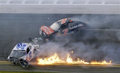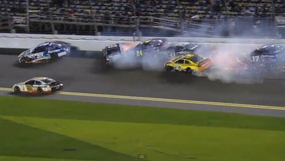 美國NASCAR賽車最近在佛州展開開季的衝刺賽,由車手漢林(Denny Hamlin)拿下冠軍。這一站的比賽過程是「撞況連連」,其中最恐怖的一起大追撞,多輛車撞到交疊還起火,...
