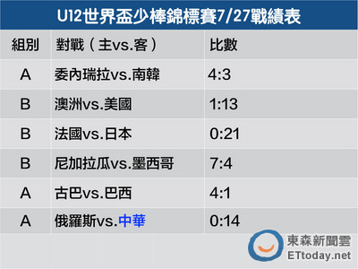 U12世界盃27日賽程A組由委內瑞拉隊、古巴隊和中華隊隊贏得比賽;B組則是美國隊、日本隊和尼加拉瓜隊勝出,中華隊預賽最後一日、28日將在下午6點30分於台南市立棒球場出...