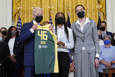 WNBA上一季總冠軍西雅圖風暴美國時間23日被邀請到白宮,美國總統拜登親自接見並收下有自己名字的46號球衣 ,這也是5年來首次在有WNBA冠軍隊至白宮。
