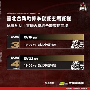 台北台新戰神前進季後賽,將迎戰例行賽龍頭新北中信特攻,首場賽事自客場5月4日出發,於5月9日回到主場首戰,主場賽事地點移師台大綜合體育館舉行。即將迎戰例行賽龍頭...