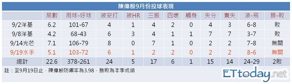 ▼陳偉殷9月份投球表現。(圖/ETToday新聞雲製表)