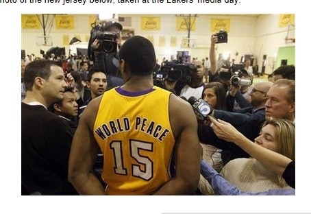 為了讓名字有實質上的改變,世界和平曾表示,要把「World Peace」貼在球衣背後,而他也說話算話,12日與媒體見面,他身穿湖人球衣亮相,15號背號上方,的確有「World Peace」字樣,媒體當然不會錯過這個畫面,將這鏡頭拍下來,就怕他改變主意,開幕時換回原名。