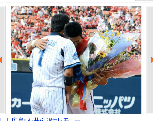 ▲石井琢朗引退賽從前隊友金城龍彥手中接過花束。(圖/擷取自Daily Sports)