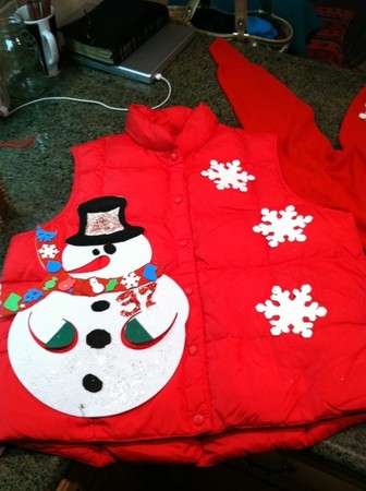 其實這是小史為了參加「醜陋聖誕衣服趴」所準備的背心,一如其他應景的衣服,他的背心和大家一樣「紅吱吱」,不同的是,衣服右半邊有三個超大又突鶩的超大雪花,左邊的雪人有著奇特的大小眼,左胸前還有小史專屬的37號,若不是他說要去跑趴,還真讓人以為小史的品味不太好。