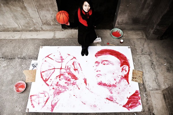 近日惡搞版姚明漫畫頭像在網路瘋傳,是拿來當作搞笑對白的好題材,而上海有一位氣質圍巾妹顛覆印象,在街頭用自己的藝術細胞,將她所見到的姚明畫下來,完成品非常具有復古氣息,比KUSO版更有特色,而圍巾妹繪畫所用的工具沒有別的,正是用姚明從前老本行,籃球。