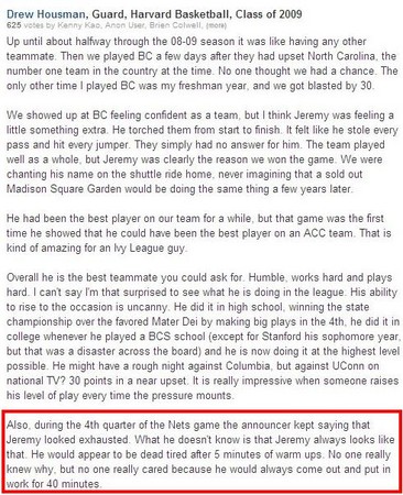但是,林書豪在哈佛時期的隊友豪斯曼(Drew Housman)於「社交問答網站」Quora的一篇留言,或許能讓關心「豪小子」的球迷安心一些。豪斯曼提到,「在尼克對籃網的第4節,球賽轉播人員一直說林書豪看起來很累,但其實他總是那副樣子;林書豪可以在熱身5分鐘後就累得一副死人德行,沒人知道為什麼,但也沒有人會在意,因為他隨後還是可以繼續練習40分鐘。」