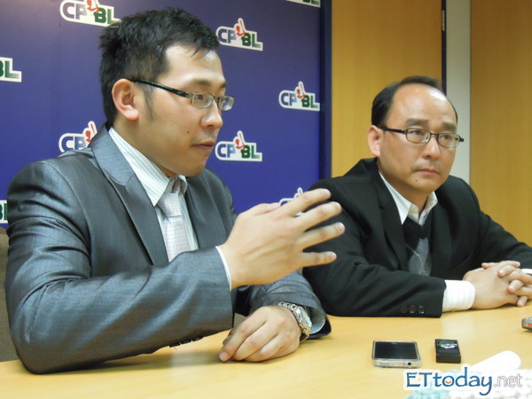 ▲統一獅領隊蘇泰安(右)說明呂文生背信事件。(圖/記者劉肇育)