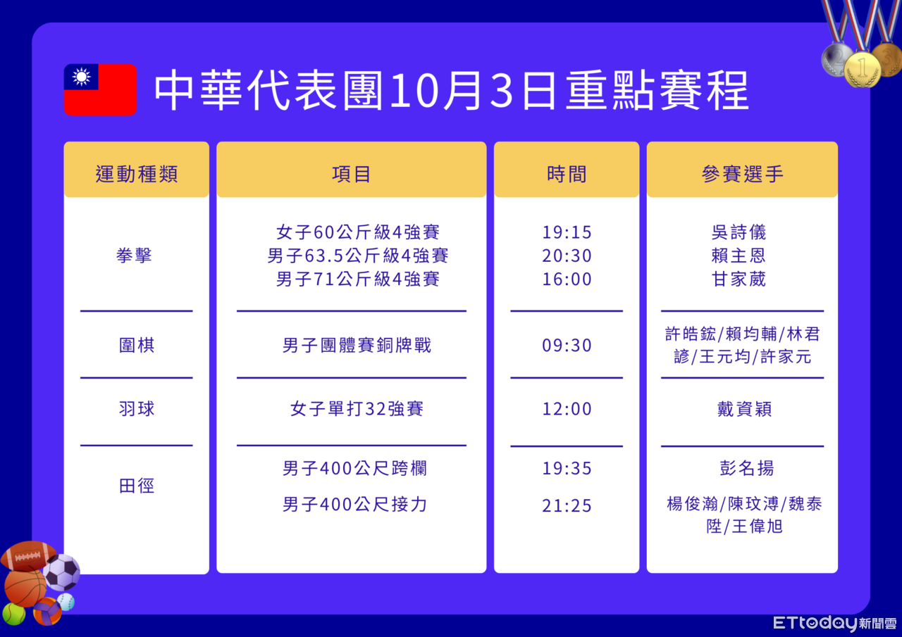 ▲中華代表團10月3日重點賽程。(圖/記者游郁香製圖)