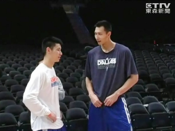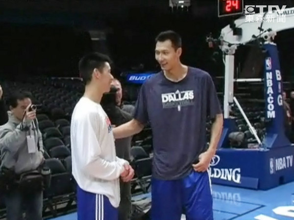 尼克和小牛的賽前練球,場邊看到同時有兩名華裔球員的難得畫面,林書豪和易建聯兩人笑容滿面,愉快地在場邊交談,林書豪雙手叉腰,易建聯甚至還撩起T恤,氣氛相當輕鬆,易建聯主動拍了林書豪一下,看起來是為他加油。