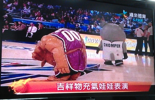 就在比賽時間最後時刻,讓所以觀眾提神的「笑點」來了,下半場賽事暫停,芝加哥公牛、魔術、明尼蘇達灰狼、國王隊其他吉祥物利用他們的充氣式娃娃特性,來一段動作怪異的舞蹈秀,搖搖擺擺地跳動,已經讓快睡著的觀眾笑得合攏不嘴,這時卻發生令人再也控制不住的意外。