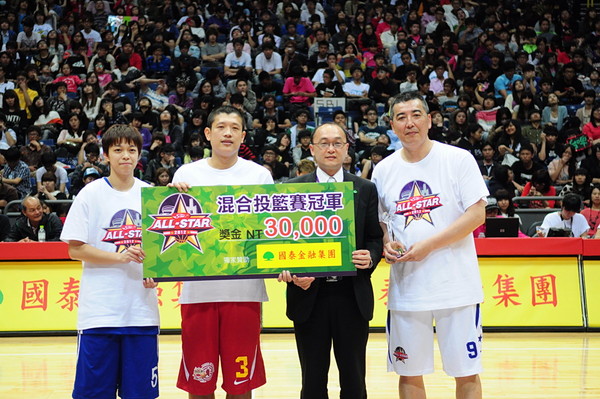 SBL超級籃球聯賽25日男女混合投籃賽,難得一見看到各隊總教練下場投球,搭配一位子弟兵和一位女籃選手,最後由賴良宗總教練率領的台灣銀行勝出。