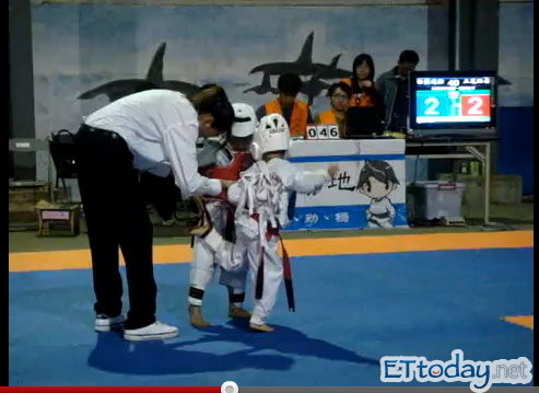 兩名小小選手激戰過頭,不時跌倒在地,身上穿的護具背後繫帶多次脫落,身材高挑的女主審還得幫他們重新繫好,繼繼你一腳、我一腳打著,小腿還會卡進對方腰際的道帶內糾在一起,惹得裁判席的陪審及場外觀戰家長哄堂大笑,女主審面帶笑容再次解圍,還不時摸摸小小選手的頭稱讚打得好。
