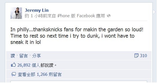 就算比完賽馬上收行李,搭上交通工具前往費城,林書豪不忘在臉書留言與網友互動,他在臉書上表示,「在費城了,謝謝尼克粉絲在花園大聲的呼喊!我該休息了,下次我灌籃時,就不會偷偷來囉,哈。」