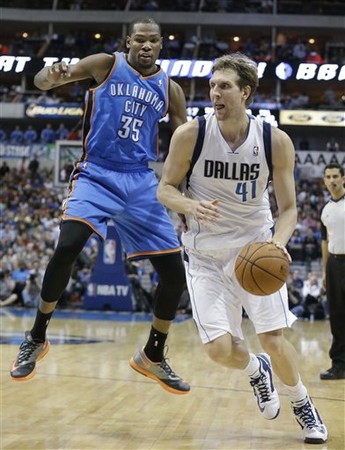 前一場面對籃網之戰失準的小牛「德國坦克」諾威斯基(Dirk Nowitzki),26日在主場迎戰雷霆的比賽中大發神威,砍進全隊最高的32分,還外帶10籃板、6助攻和4抄截的全能數據,率領小牛最終在延長賽以128比119擊退雷霆。
