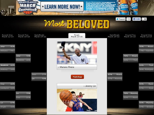 這項票選活動從3月13日就開始,ESPN先選出16名紐約的職業運動員,進行一對一對的票選對決,林書豪的隊友甜瓜安東尼和史陶德邁爾也有入選,而林書豪被列為第四種子,他一路過關斬將,在準決賽勝過頭號種子洋基隊的基特,終於在決賽遭遇李維拉。