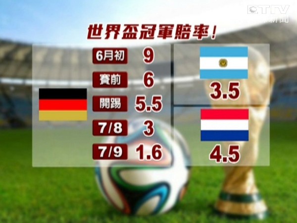就因為球迷大多看好德國隊,台灣運彩不得不啟動風險控管機制,重新調整賠率,以世界盃足球賽冠軍戰不讓分的玩法來看,原本德國賠率2.0,封盤後下修到1.9,對手球隊阿根廷則是從3.3上修到3.6,有人一買就是好幾萬元,還有人揪團包牌,買了長長一串彩券,必勝決心強,不少民眾表示是與朋友一起合買的。