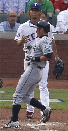 德州遊騎兵日伊混血投手達比修有,10日進行大聯盟初登板,遭到西雅圖水手砲轟狂失5分,仍倚賴著打線發揮,獲得大聯盟首勝,被換下場休息時,德州主場球迷給予熱情歡呼,達比修僅是低著頭走回休息室,並未脫帽向觀眾致意,賽後鈴木一朗認為,這個舉動讓他蠻欣賞。
