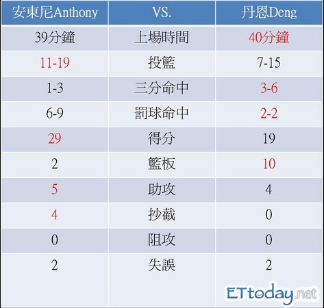 ▲安東尼與公牛隊丹恩本場攻守數據比較。(圖/ETtoday新聞雲製表)