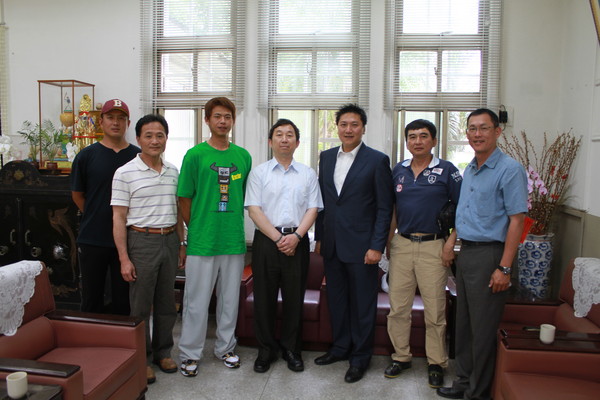 ▲紀榮家(左三)12日在領隊楊仁佑和總教練劉榮華的陪同下,完成捐款回饋母校的心願。(圖/興農球團提供)