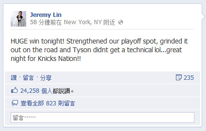 林書豪今天並沒有隨隊前往密爾瓦基,但他在球隊111比107險勝公鹿拿到重要勝利不久後,隨即在個人臉書發文。林書豪寫道今天是重大的勝利,讓球隊季後賽資格更穩固,加上錢德勒沒有吞下任何技術犯規,對紐約球迷是美好的夜晚。