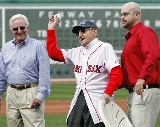 波士頓紅襪的主場芬威球場,今年已邁入100年,是大聯盟最古老的球場。15日他們舉行一個很有意義且溫馨的開球儀式──請到一個元老級的球迷,在他100歲生日時開球慶祝球場100歲。