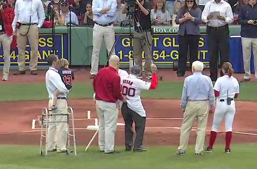 霍根(Bill Hogan Jr.)出生於西元1912年,比芬威球場在1912年4月20日舉行第一場球賽還要早6天。在他100歲生日這天,帶著13個孫子與18個曾孫,身穿代表自己年紀的背號球衣,為紅襪對坦帕灣光芒的比賽開球。