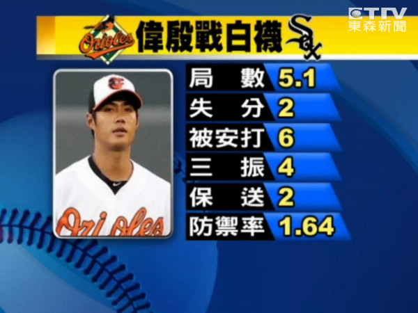 第6局戰情起變化,金鶯棒子發燙,瑞蒙德(Nolan Reimold)、哈迪(J.J. Hardy)接連兩支全壘打攻下3分取得領先。不過白襪也在6局下立即展開猛烈反撲,趁著1次暴投、1次捕逸再加上3支安打追回了2分,陳偉殷遭遇亂流被教練換下場休息,仍是1分領先的勝投候選人。