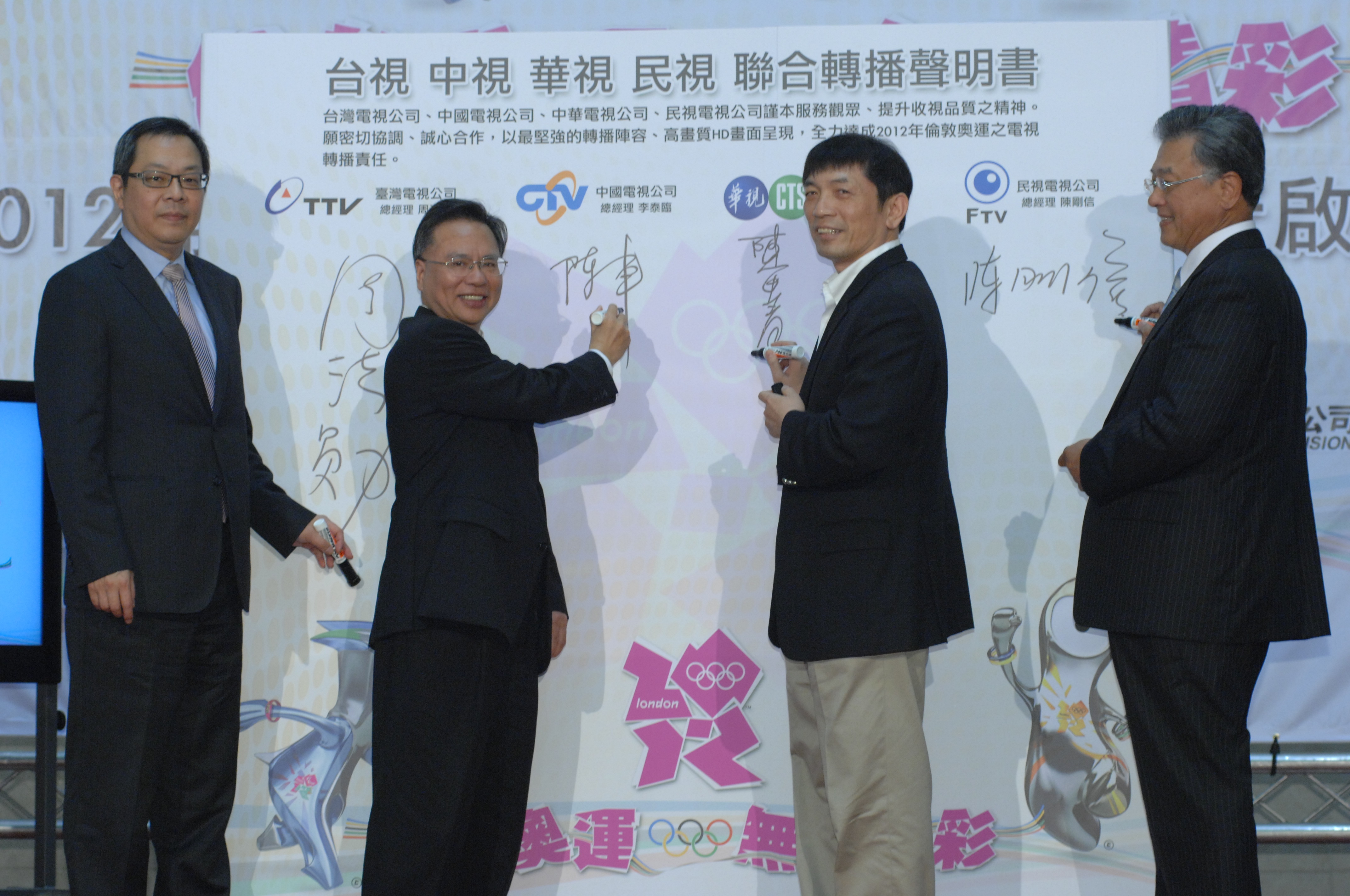 ▲民視總經理陳剛信(右起)、華視副總陳申青、中視副總陳車、台視總經理周法勛19日簽署2012奧運聯合轉播聲明書。