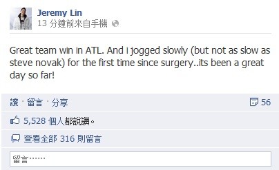 林書豪向來是臉書與推特的愛用者,拿下重要勝利,他即便無法與隊友作戰,仍發文為尼克隊高興,他在最新的留言說道,「超棒的隊伍在亞特蘭大贏了。我現在跑得很慢(但不會和諾瓦克一樣慢),這是手術以來第一次,也是目前為止過得最棒的一天!」