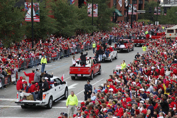 奪下世界大賽冠軍的紅雀隊,在聖路易當地時間星期天下午四點開始,紅雀隊全體球員和教練團、吉祥物Fredbird、幸運松鼠Rally Squirrel都出席了,而慶祝活動在球場Busch Stadium引爆,人數多到無法估計,整個城市的狂歡幾乎接近沸騰,總教練拉魯薩(Tony La Russa)說,「在這個城市裡有太多支持我們的球迷,經歷了一年的征戰和盼望,我們終於等到了這一刻,沒有球迷就不會有我們,我在這裡像所有的球迷還有團隊呈上最真誠的謝意。」