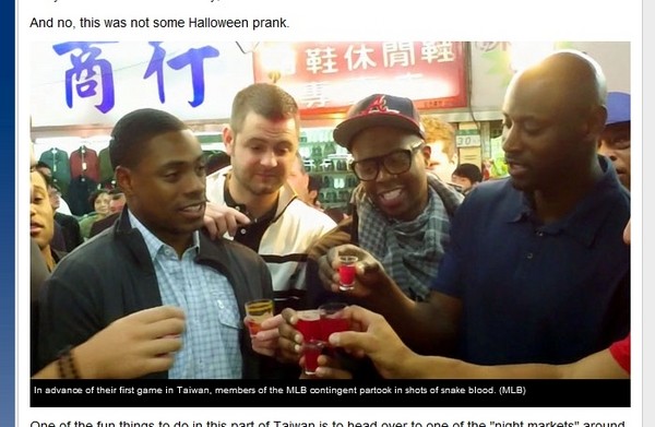 來到台灣,大聯盟球星們當然要嚐嚐道地的文化,洋基葛蘭德森(Curtis Granderson)、坎諾(Robinson Cano)與馬林魚隊莫瑞森(Logan Morrison)一行人,31日晚間浩浩蕩蕩來到華西街夜市,挑戰連台灣人也可能抗拒的蛇血,莫瑞森嚐完之後還打趣地說,「我將擁有蜘蛛人力量,但『蛇力』會給我更多!」