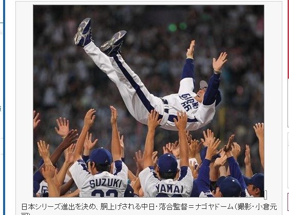 ▲中日龍進日本大賽,球員高興地將監督落合博滿拋起。(圖/取材自日本SANSPO網站)