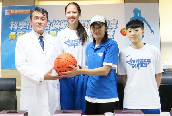 中華女籃教練錢薇娟、女籃史上最高196公分混血中鋒包喜樂以及WCBA台將彭詩晴,21日出席記者會,代表全隊致贈簽名籃球一顆,以感謝長庚運動醫學團隊長期以來的支持與照護。