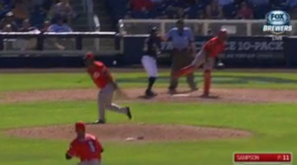 釀酒人跑者布朗克斯頓(Keon Broxton)在7局上發動盜壘,紅人捕手川普迅速站起快傳二壘,投手桑普森(Keyvius Sampson)轉過身來卻背後中箭,直接被隊友砸中身體。