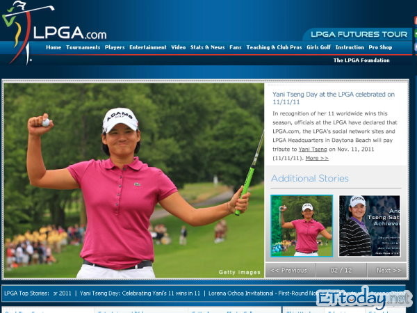 女子高爾夫LPGA官網,在美國時間11月11日破天荒的連放10張曾雅妮組圖與新聞,整個官網隨之變臉,LPGA並宣佈當天就是「曾雅妮日」,藉此表揚她今年勇奪世界第一,單季11座冠軍金杯的超優異表現,讓這位來自台灣的女孩再度被全世界矚目。